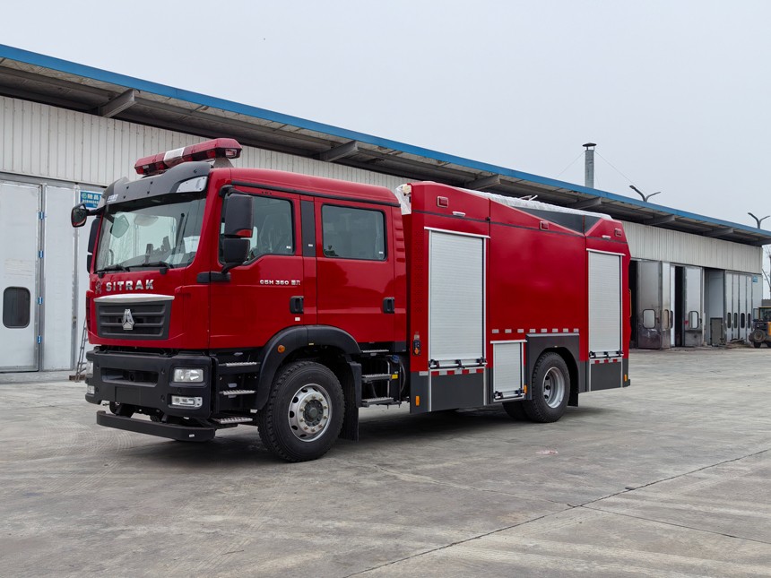 汕德卡7.2噸泡沫消防車采用中國重汽集團濟南商用車ZZ5206N471GF5底盤改裝而成。整車由消防員乘員室和車身兩大部分組成,乘員室為原裝雙排,可乘坐2+4人,該車為外露罐結構,車身前部為器材箱,中部為罐體,后部為泵房。載液罐體為優質碳鋼,內部噴涂環氧底漆及環氧瀝青漆,與底盤采用彈性連接,載水量4950kg,泡沫液量2200kg,裝備了上海雄真消防設備有限公司生產CB10/60-XZ型常壓消防泵,額定流量60L/S,車頂安裝成都威斯特消防機械有限公司生產的PL8/48型車用消防炮。該車最大的特點是載液量大、操控性好、維修簡便。可廣泛應用于公安消防隊、廠礦企業及社區、碼頭等場所,撲救大型油類火災和一般物質火災。