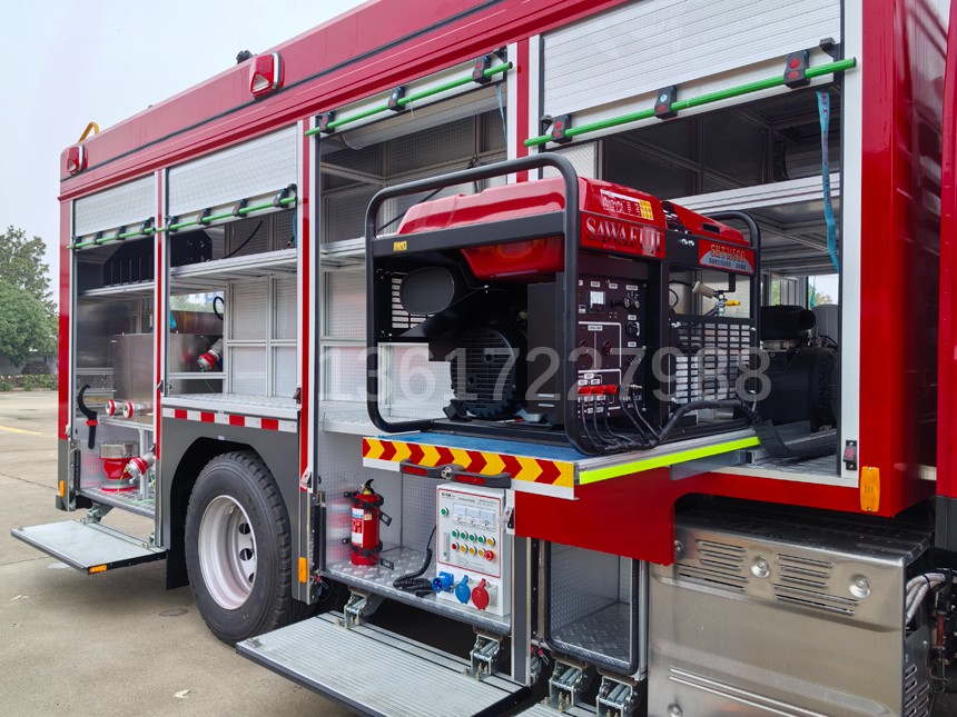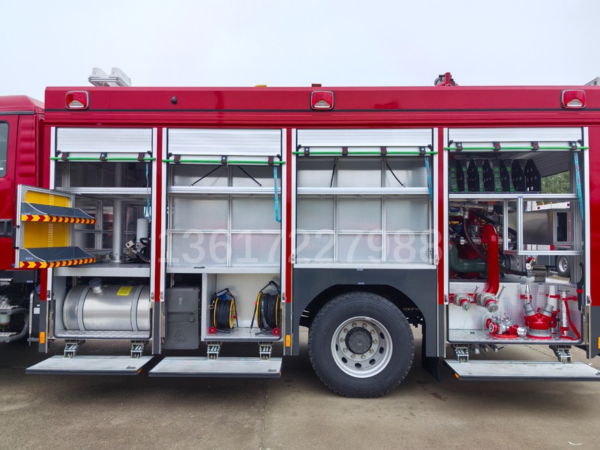 載液罐體為304不銹鋼,與底盤采用彈性連接,載水3550kg,A類泡沫液量210kg,B類泡沫液量340kg,裝備了美國希爾生產的PTO CAFS120/50FBU型消防車用壓縮空氣泡沫系統,空壓機流量3400L/min,水泵流量3600L/min,泡沫泵流量12.5L/min,壓縮空氣泡沫混合液總流量5500L/min,車頂法國博克PLKD48-SNAKE2.5(威斯特電控泡沫炮)。