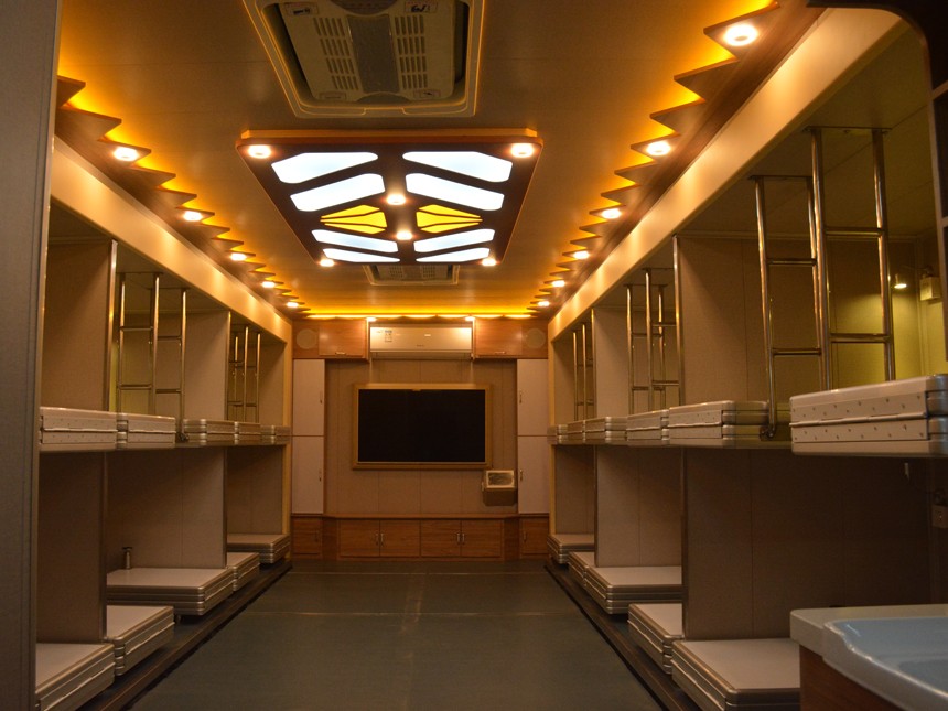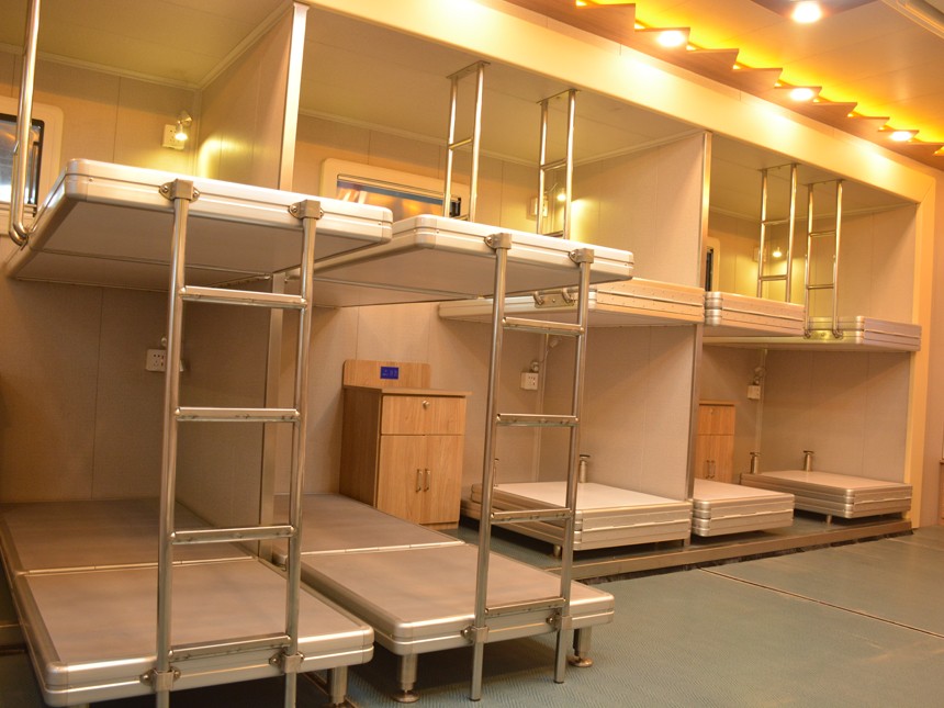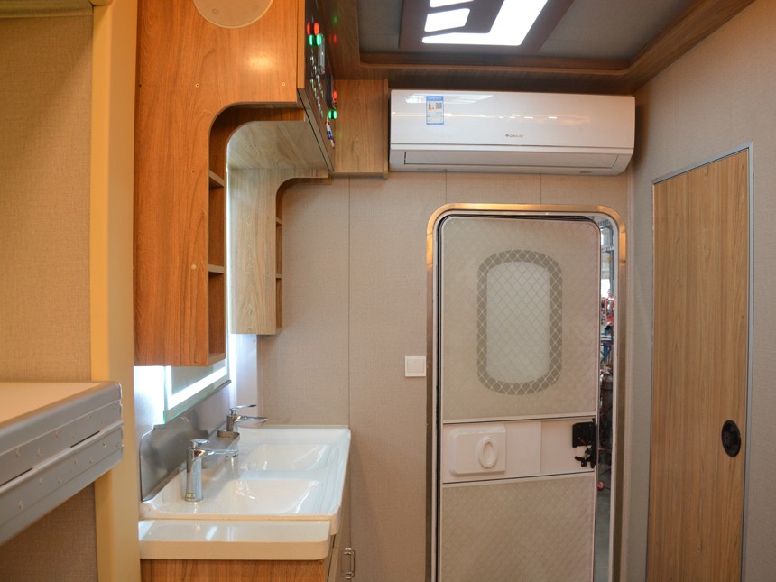 專用功能:室內(nèi)住宿設備為12組高低床,可提供24人舒適宿營;配備有冷暖空氣調(diào)節(jié)系統(tǒng)、電視影音系統(tǒng)、照明系統(tǒng)、儲物柜、床頭燈及開關(guān)插座等必要生活設施;獨立衛(wèi)生間配備有盥洗臺、LED背光整容鏡、強制通風換氣裝置、雙層外推窗、節(jié)水型不銹鋼便池等設施;發(fā)電機功率5KW,額定電壓220V,供電時長約6-10小時。 | |||